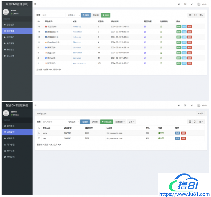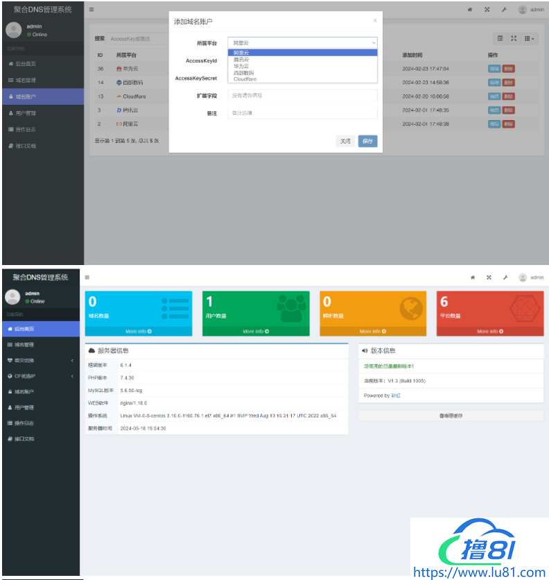 聚合DNS管理系统可以实现在一个网站内管理多个平台的域名解析,目前已支持的域名平台有:阿里云、腾讯云、华为云、西部数码、DNSLA、CloudFlare。