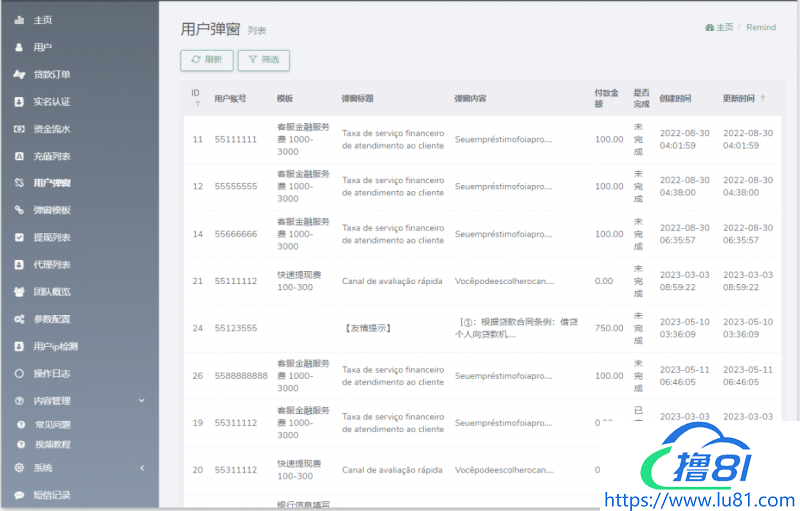 中英文海外借贷贷款平台源码,信贷产品系统源码,网络借款平台,用户自定义弹窗消息