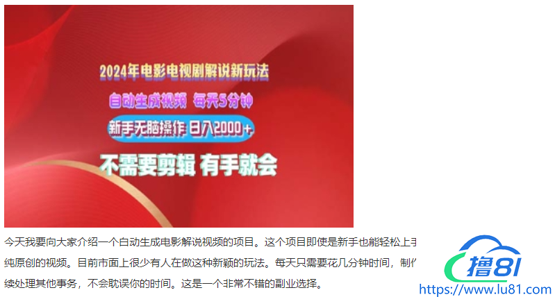 电影解说2024年全新玩法,傻瓜式操作,无脑出原创视频每天几分钟就能获取不少收益