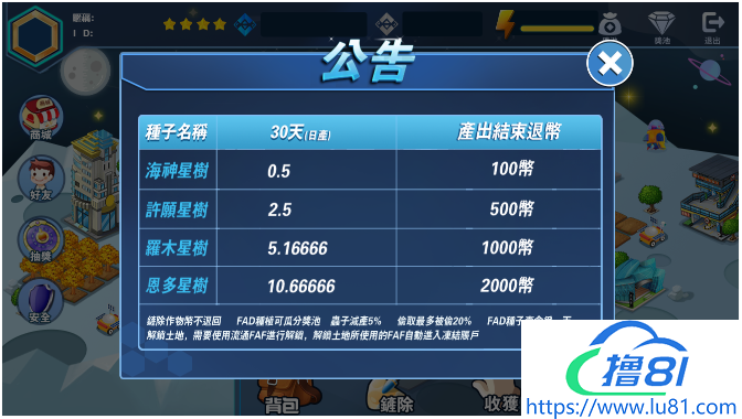 FAF农场:产除作物币不退回;FAD种植可瓜分奖;虫子减产5%;偷取最多被偷20%;FAD种子生命为一天解锁土地,需要使用流通FAF进行解锁,解资土地所使用的FAF自动进入冻结账户。具体功能看截图