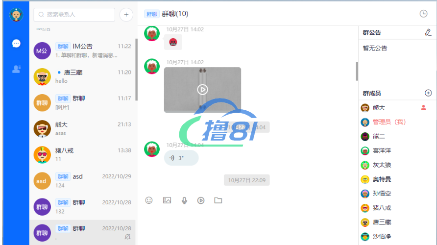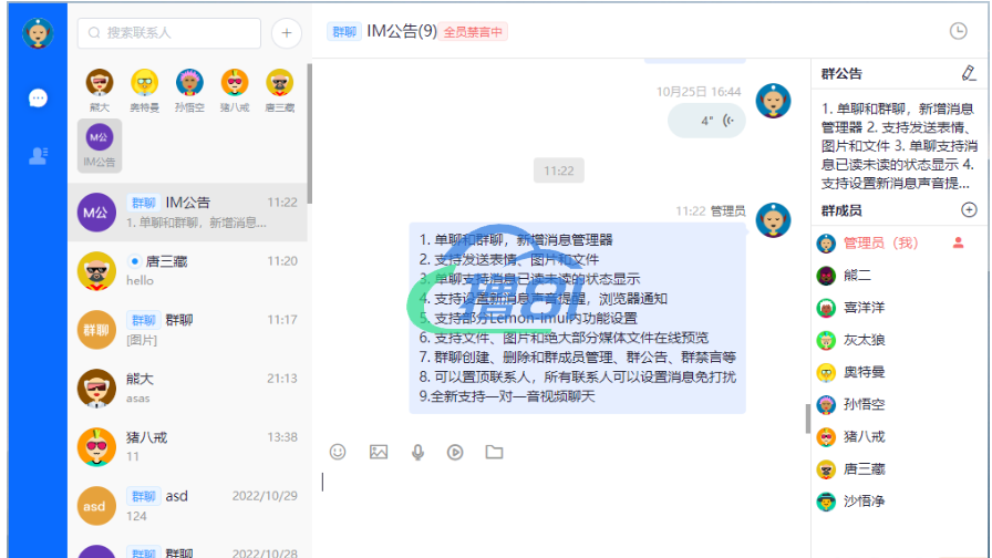 单聊和群聊功能,可以方便地发送表情、图片、语音、视频和文件消息。