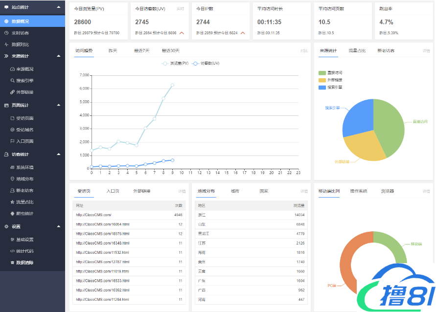 数据概况:显示PV、UV、IP等数据,方便查看。