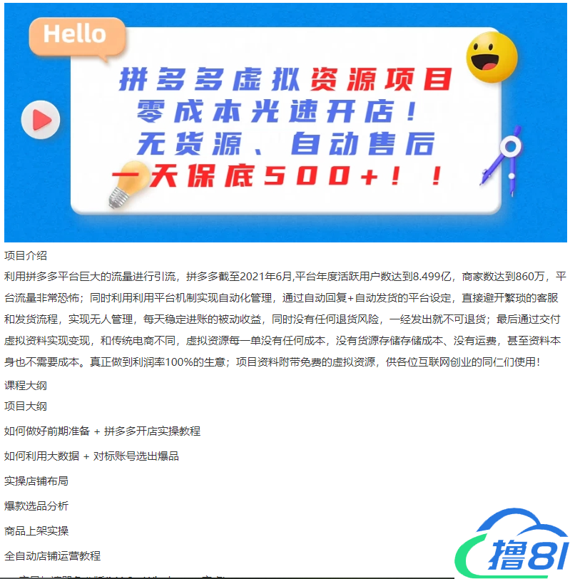 最新拼多多虚拟资源项目、零成本光速开、无货源、自动售后、一天保底500+