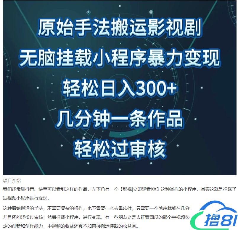 原始手法无脑搬运影视剧,单日收入300+,操作简单,几分钟生成一条视频,轻松过审核