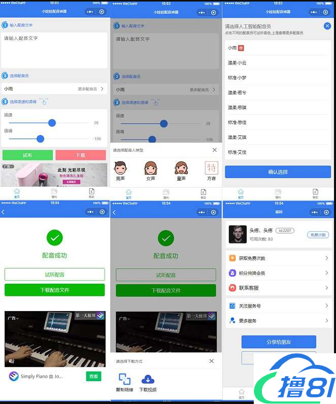配音员的添加修改,设置推荐,设置配音员的试听文字。首页轮播图支持。体验的小程序上暂时没有放出来,海报支持导流到其他的小程序,打开h5页面,banner广告,格子广告朋友圈海报合成的支持发现导流。该小程序是功能类的小程序,可以通过福利种的发现页面导流到其他的小程序中,形成流量圈兑换设置,支持积分兑换次数,积分兑换次数用户qa设置裂变,用户分享增加用户次数自定义小程序标题分享设置关注公众号