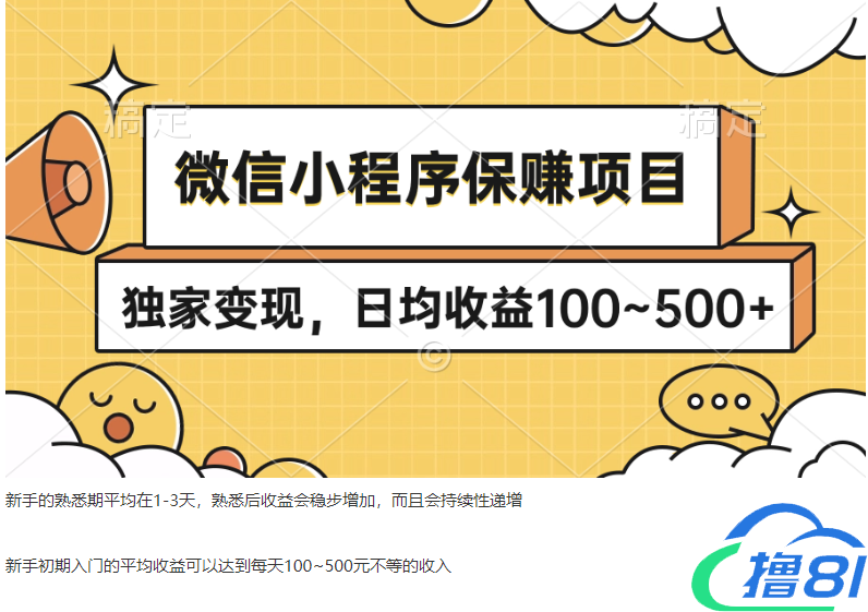 微信小程序保赚项目,独家变现,日均收益100~500+
